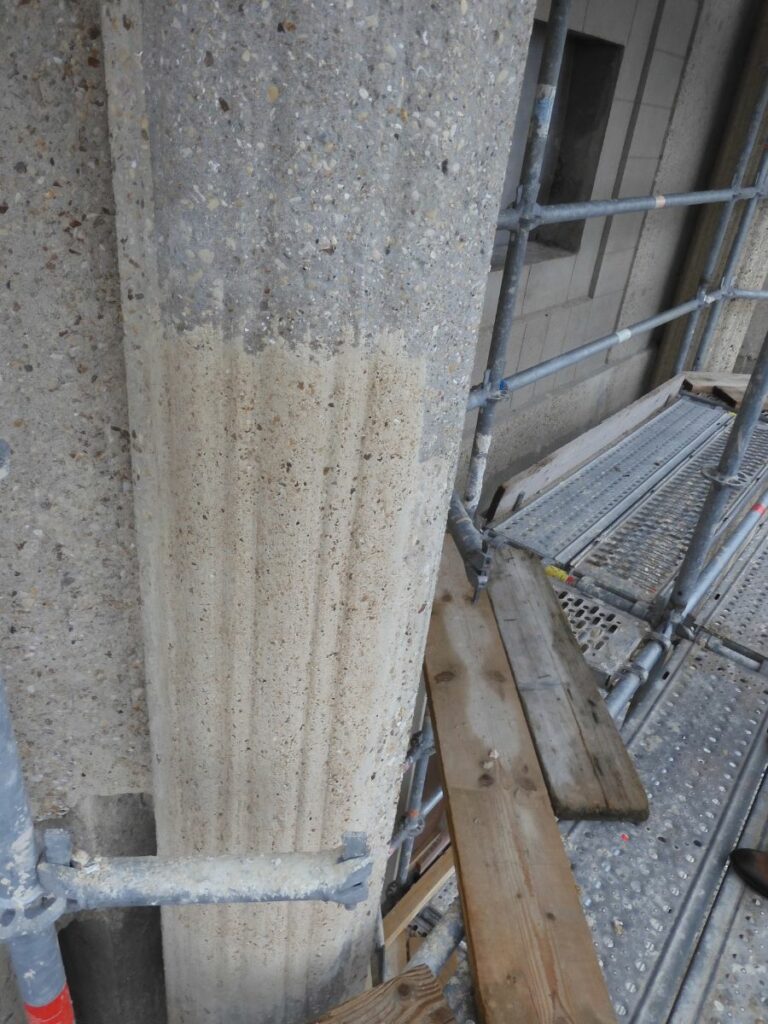 Cependant, cette restauration a permis de constater la bonne qualité du béton mis en place par les frères Perret, ainsi que la bonne tenue des restaurations précédentes. Les analyses du Laboratoire de Recherche des Monuments Historiques ont confirmé ces constats et nous ont même demandé de laisser en place certaines restaurations antérieures, bien qu’elles soient en ciment gris. La technique des coffrages en bois des colonnes extérieures groupées est restée pour nous en grande partie mystérieuse, témoignage du savoir-faire exceptionnel des bâtisseurs de l’époque.